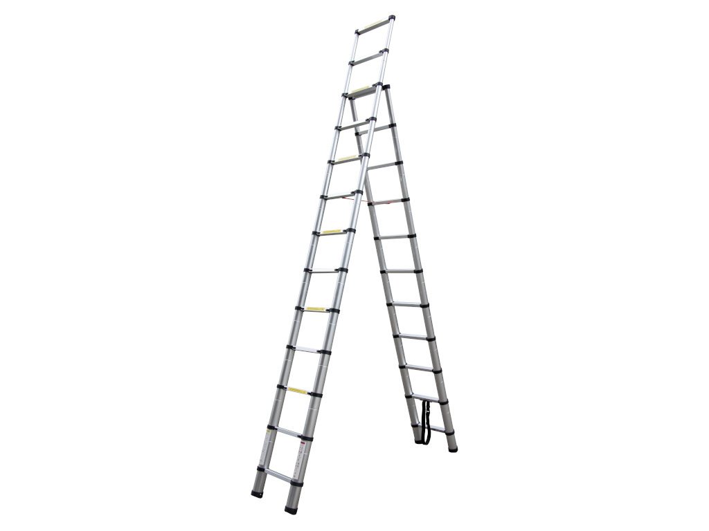Az 13 és 13 fokos teleszkópos lépcsők univerzális megoldást jelentenek a ház, a nyaraló, a raktár vagy az üzlet számára. A különböző átmérőjű alumíniumcsövekből álló modern konstrukció lehetővé teszi, hogy a létra hihetetlenül kicsire összehajtható legyen (csomagméret 88x51x21 cm). Néhány pillanat alatt olyan létrává alakítható, amelynek hosszabbik oldala akár 3,8 m-re is felér. Mindenekelőtt rugalmasságával és sokoldalúságával tűnik ki. A hosszabbik oldal utolsó két lépcsőfoka támasztékot biztosít, amelybe belekapaszkodhat munka közben.
