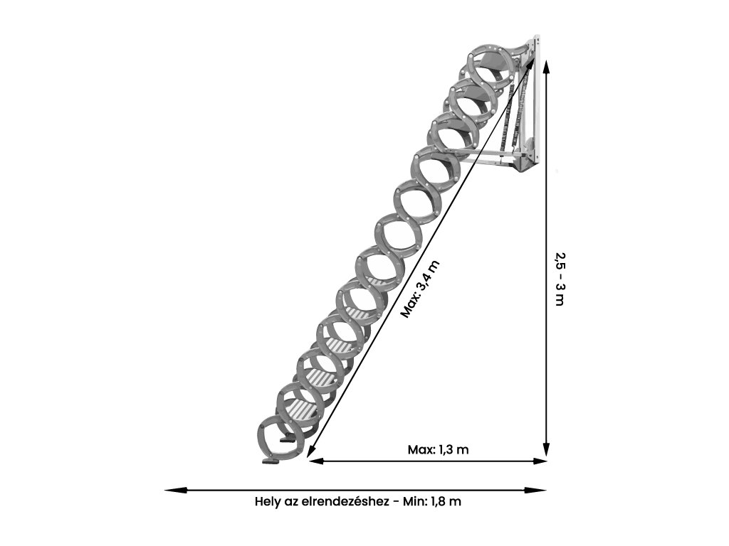 Praktikus kihúzható elektromos lépcső a felső szintre való feljutáshoz. A lépcsőt nem kell közvetlenül a padlástérhez használni, hanem a garázs, a tetőtérbővítés vagy a műhely következő emeletére való feljutáshoz is használható. A távirányítóval a lépcső nagyon könnyen kezelhető. Az elektromos motor segítségével a lépcső pillanatok alatt kibontakozik, és már használhatja is. Visszacsukása eredeti állapotába hasonlóan gyors. A lépcső a mennyezeti keretben rejtőzik, és nem akadályozza a teret.