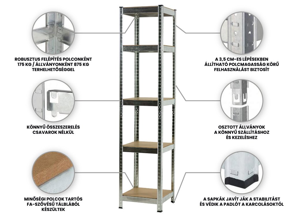 Kiváló minőségű és stabil Salgó polc öt állítható polccal költséghatékony megoldást jelent a tárgyai tárolására. Maximális terhelhetőség / polclaponként 175 kg, azaz 875 kg / állványonként. A FISTAR márkás Salgó polcok hengerelt acélból készülnek, kiváló minőség jellemzi őket és 7 éves garancia. A Salgó polcot háztartásokban, irodákban, műhelyekben és garázsokban, valamint raktárakban vagy ipari helyiségekben lehet használni.