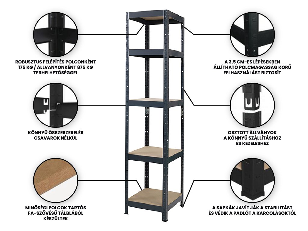 Kiváló minőségű és stabil Salgó polc öt állítható polccal költséghatékony megoldást jelent a tárgyai tárolására. Maximális terhelhetőség / polclaponként 175 kg, azaz 875 kg / állványonként. A FISTAR márkás Salgó polcok hengerelt acélból készülnek, kiváló minőség jellemzi őket és 7 éves garancia. A Salgó polcot háztartásokban, irodákban, műhelyekben és garázsokban, valamint raktárakban vagy ipari helyiségekben lehet használni.