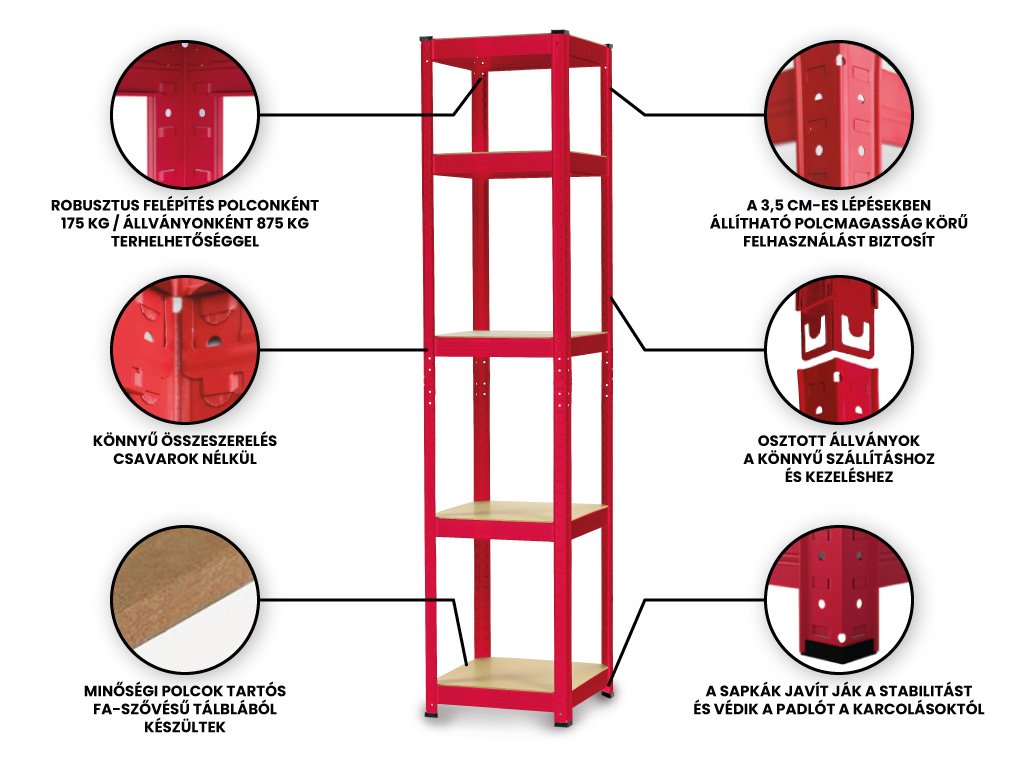 Kiváló minőségű és stabil Salgó polc öt állítható polccal költséghatékony megoldást jelent a tárgyai tárolására. Maximális terhelhetőség / polclaponként 175 kg, azaz 875 kg / állványonként. A FISTAR márkás Salgó polcok hengerelt acélból készülnek, kiváló minőség jellemzi őket és 7 éves garancia. A Salgó polcot háztartásokban, irodákban, műhelyekben és garázsokban, valamint raktárakban vagy ipari helyiségekben lehet használni.