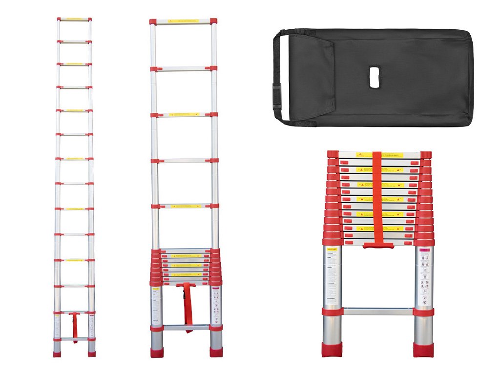 Az összecsukott teleszkópos létra egy szállítótáskában tárolható. Ez megkönnyíti a szállítást, tárolást és a pormentességet. Összehajtva könnyű, és könnyen elfér az autóban. Ugyanakkor nagyon tartós és biztonságos. Akár 150 kg-os terhelést is kibír.