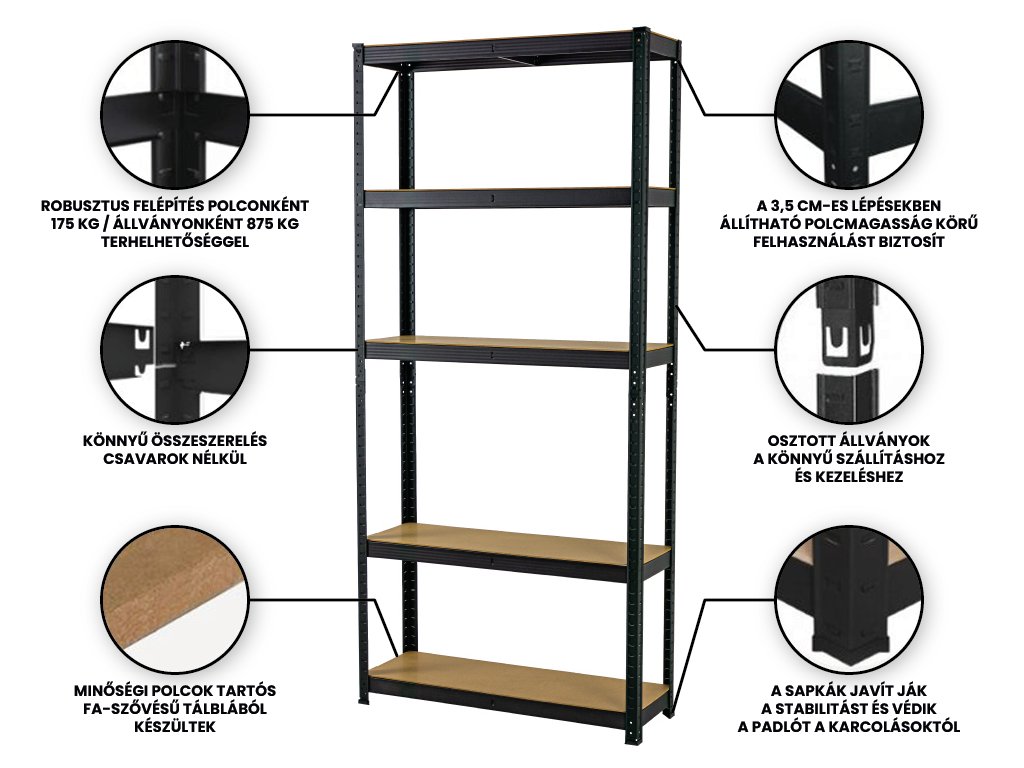 Kiváló minőségű és stabil Salgó polc négy állítható polccal költséghatékony megoldást jelent a tárgyai tárolására. Maximális terhelhetőség / polclaponként 175 kg, azaz 700 kg / állványonként. A FISTAR márkás Salgó polcok hengerelt acélból készülnek, kiváló minőség jellemzi őket és 7 éves garancia. A Salgó polcot háztartásokban, irodákban, műhelyekben és garázsokban, valamint raktárakban vagy ipari helyiségekben lehet használni.