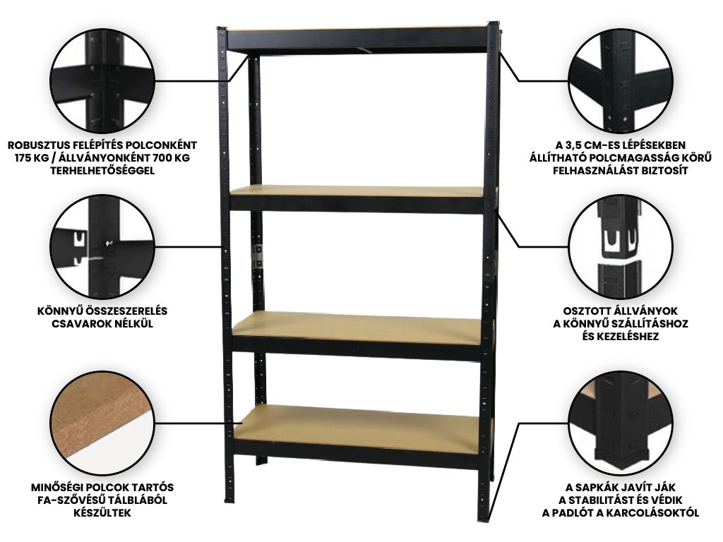 Kiváló minőségű és stabil Salgó polc négy állítható polccal költséghatékony megoldást jelent a tárgyai tárolására. Maximális terhelhetőség / polclaponként 175 kg, azaz 700 kg / állványonként. A FISTAR márkás Salgó polcok hengerelt acélból készülnek, kiváló minőség jellemzi őket és 7 éves garancia. Az állványokat háztartásokban, irodákban, műhelyekben és garázsokban, valamint raktárakban vagy ipari helyiségekben lehet használni.